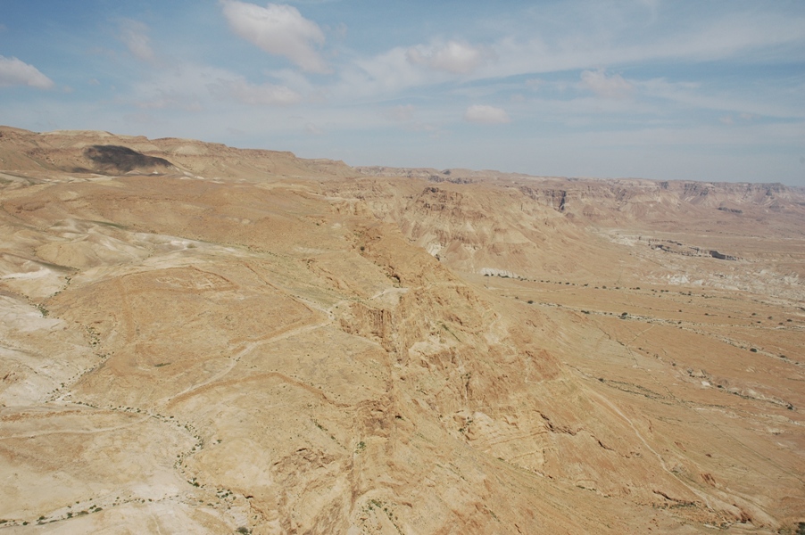 From this side of Masada you can see the 2,000-year old remains of one of the Roman’s military camps (center left) and siege wall, as well as the trail that heads north to the Ein Gedi oasis (in the upper right corner).