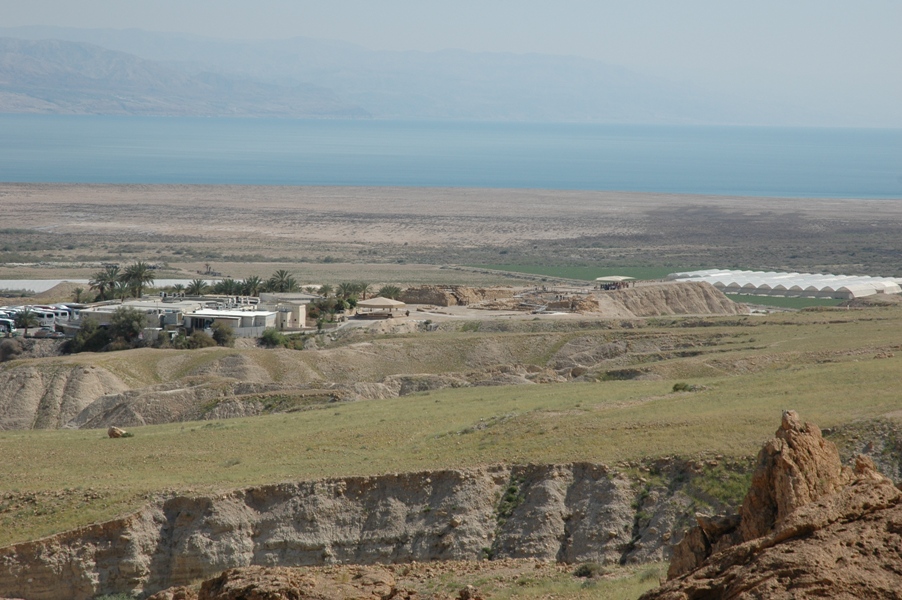 Along the northeastern shore of the Dead Sea, the ancient site of Khirbet Qumran, where the Dead Sea scrolls were found.