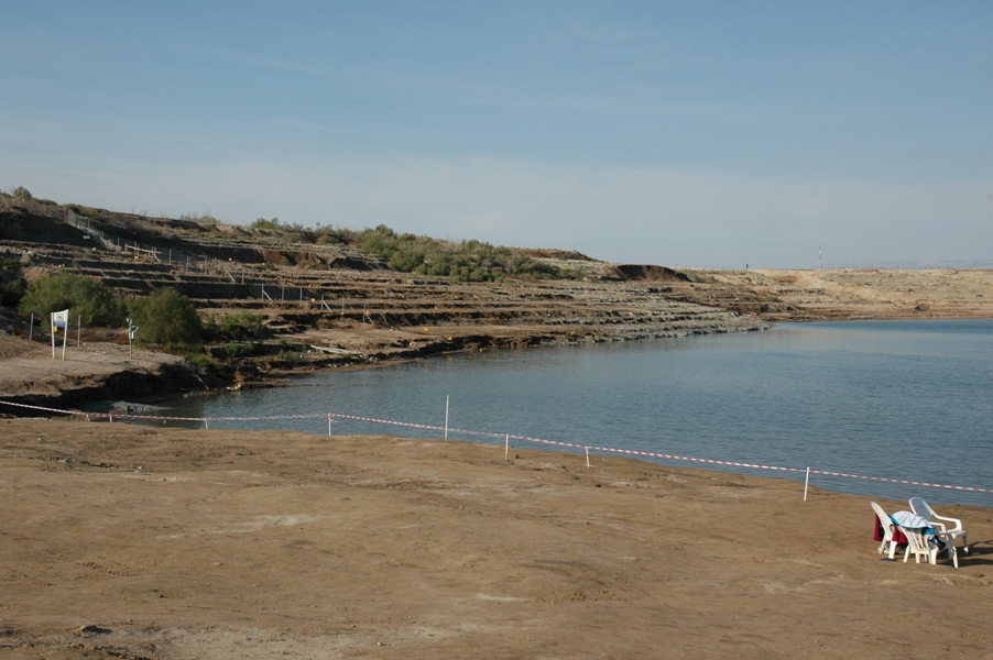 Next to our Dead Sea beach, the shore showed how the Dead Sea has been dropping precipitously in recent years.