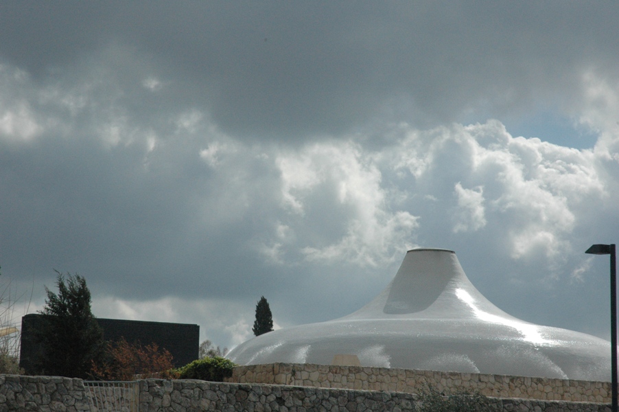 The Shrine of the Book, also at the Israel Museum, holds some of the Dead Sea Scrolls and related artifacts. The white dome resembles the tops of the jars in which the scrolls were found, and the contrast with the black wall represents the battle between the Sons of Light and the Sons of Darkness referenced in some of the scrolls.