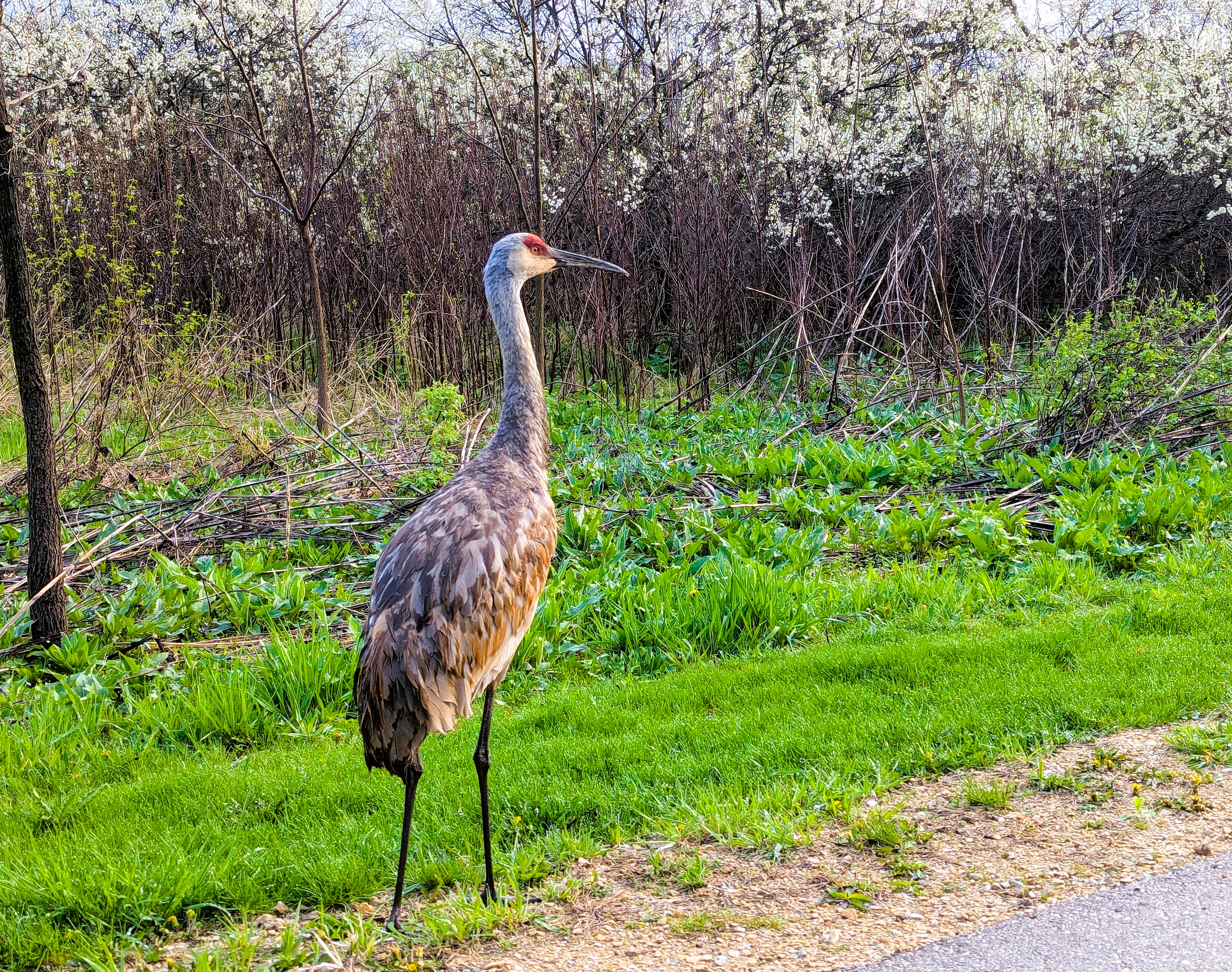 When I stepped back on the path and turned around, I was stunned. There was a sandhill crane, close enough he could have tapped me on the shoulder if he wanted to. Then I realized, this was not an ordinary spring morning.
