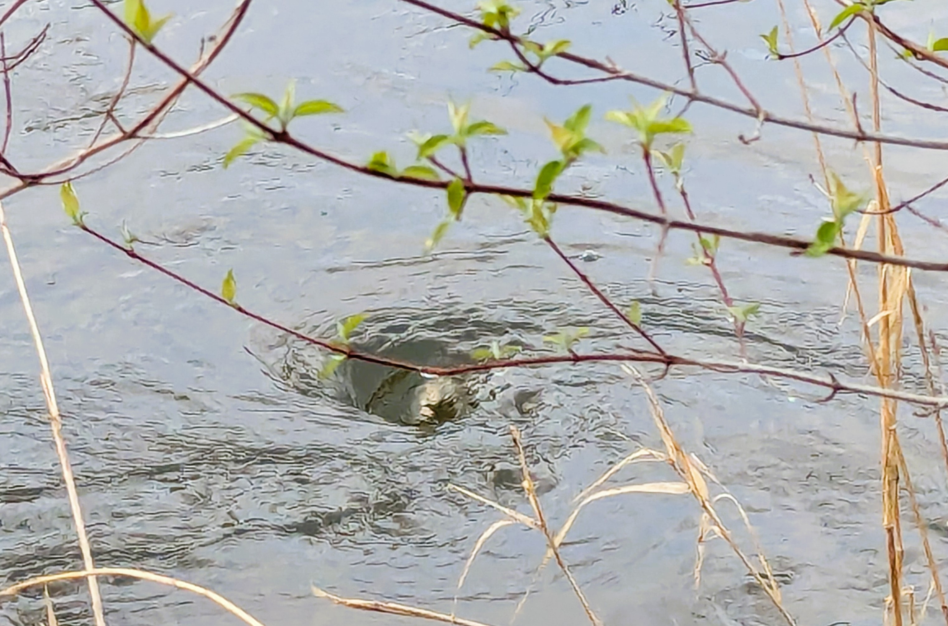 Further along the path, a whirlpool in a pond of run-off with a pair of wood ducks floating nearby.