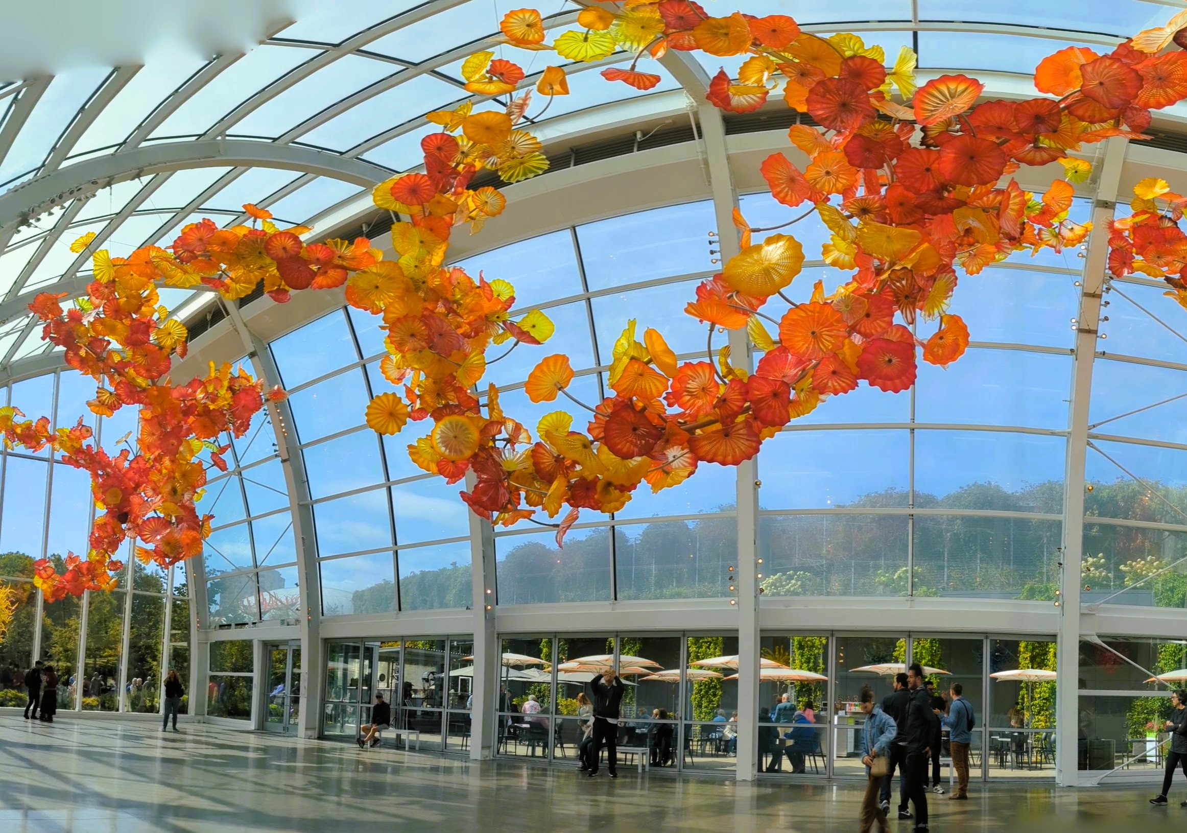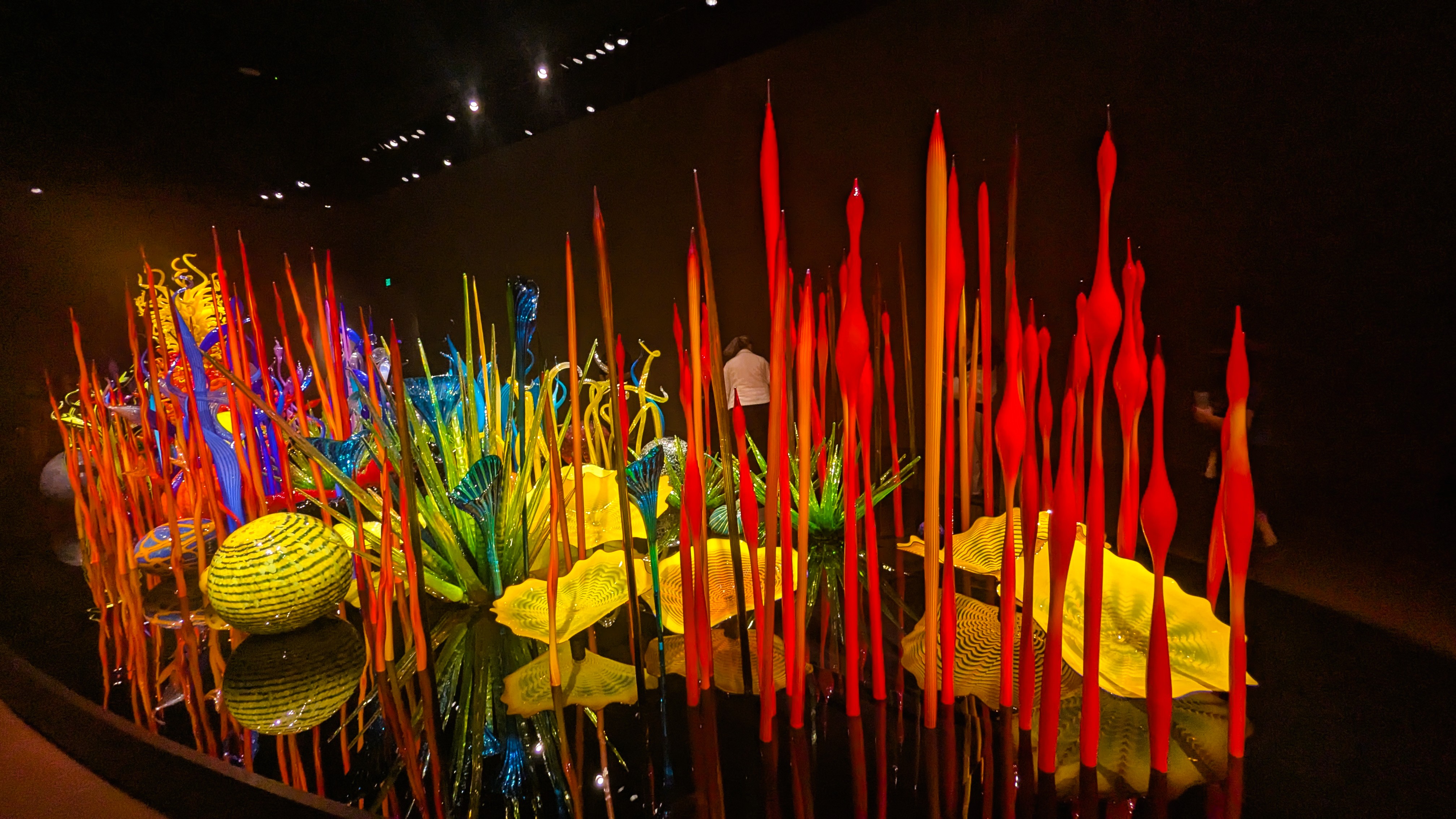 And then on to the Chihuly Museum. Dale Chihuly was trained in the UW’s (that’s University of Wisconsin, not Washington) blown glass lab, the first collegiate glass blowing lab in the country, and became an internationally known artist. This display is called Mille Fiori, “a thousand flowers.”